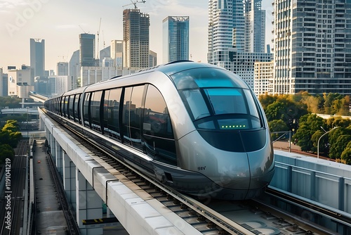 © Afsheen fatima , Naklejka premium A sleek, modern train travels on an elevated track through a dense cityscape. Tall buildings and a sunrise backdrop highlight efficient urban transit.