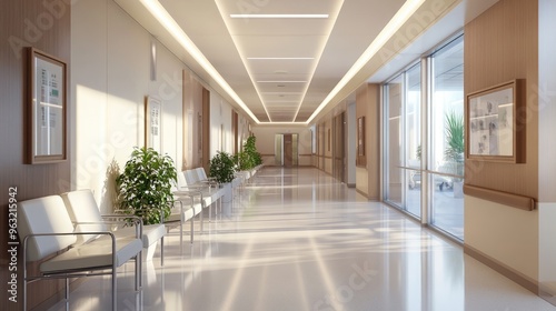 © 69, Fototapeta premium A sleek, modern waiting area in a hospital corridor filled with light, promoting calm and comfort for patients.
