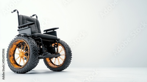 Naklejka premium A sleek, modern wheelchair featuring rugged, vibrant orange tires, merging...