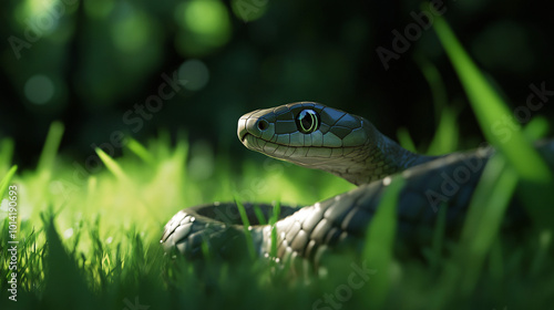 © GoldPumaze, Fototapeta premium A sleek racer snake gliding through the grass