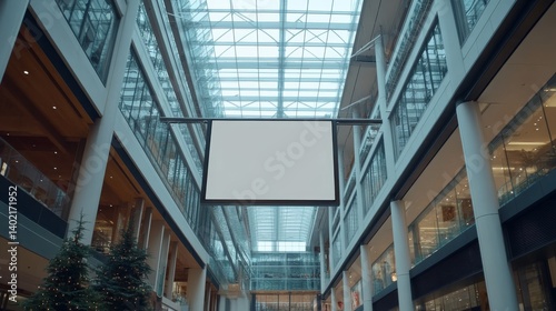 © Elena, Fototapeta premium A sleek rectangular sign hangs from metal brackets in a spacious building under a glass ceiling, ideal for advertising or guiding visitors effectively
