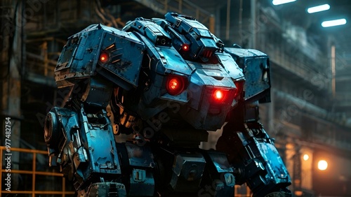 © Ashian, Fototapeta premium A sleek robot positioned before a factory, symbolizing the integration of automation in modern manufacturing processes.