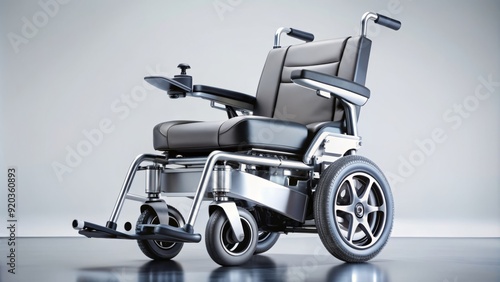 Fototapeta premium A sleek, silver, high-tech wheelchair with sturdy wheels and adjustable armrests, showcasing modern accessibility and mobility for individuals with disabilities.