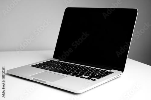 Fototapeta premium A sleek silver laptop with a black screen sits on a white table against a neutral background.