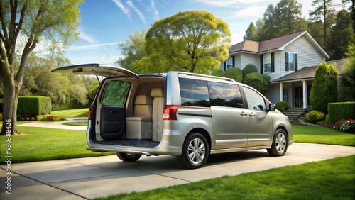 Fototapeta premium A sleek, silver minivan is parked in a suburban driveway, with sliding side...
