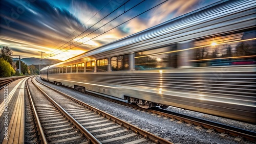 © Caitlin, Fototapeta premium A Sleek Silver Train Speeds Along The Tracks, Passing A Station Platform At Sunset.