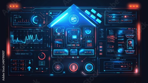 © Usman, Obraz premium A sleek smart home control panel with interactive touchscreens controlling lighting, temperature, and security.