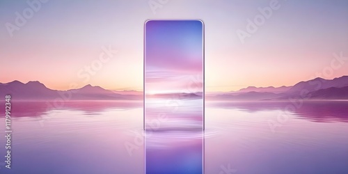 Fototapeta premium A sleek smartphone stands upright in a serene lake, reflecting a beautiful...