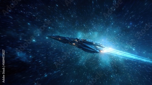 Fototapeta premium A sleek spaceship soars through the dark cosmos, its lights blazing against a...