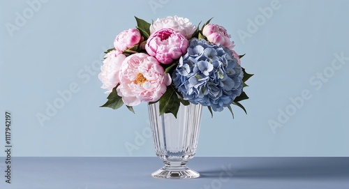 © Arceli, Fototapeta premium A sleek tall crystal vase with a delicate arrangement of peonies and hydrangeas placed on a plain sky blue background