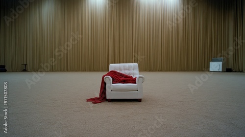 Naklejka premium A sleek white chair with a vibrant red blanket invites comfort in a spacious room featuring soft lighting and minimalist decor, offering a serene atmosphere