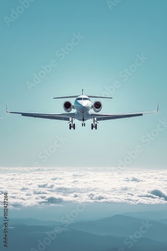 Fototapeta premium A sleek white jet aircraft flying above fluffy clouds, showcasing modern...
