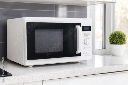 Obraz premium A sleek white microwave oven on a modern kitchen countertop, perfect for...