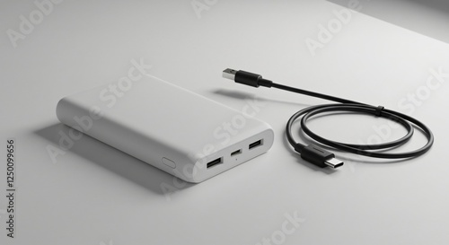 Fototapeta premium A sleek white power bank with dual USB ports and a black Type-C charging cable, placed on a clean surface, showcasing a modern and minimalistic design.