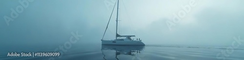 Fototapeta premium A sleek yacht floats motionless amidst the thick fog, its rigging swaying...