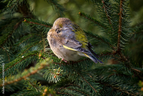 © DoreenB. Photography, Fototapeta premium a sleeping and wet greenfinch after a rainy night, perched on a spruce at a spring morning