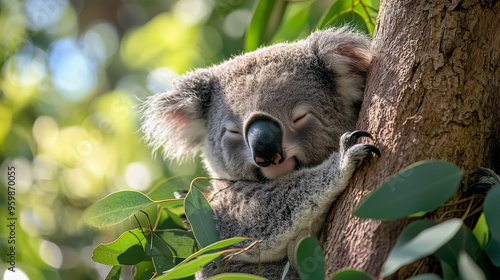 Obraz premium A sleepy koala clinging to a eucalyptus tree, with a peaceful expression and...