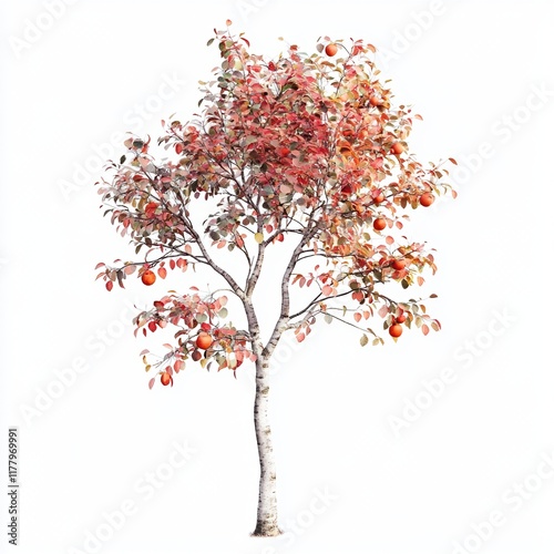 © Natalia, Fototapeta premium A slender apple tree with a smooth trunk, autumnal red and orange leaves, and scattered ripe apples isolated on a white background