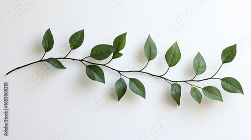 Fototapeta premium A slender branch with vibrant green leaves extends horizontally across a plain white background