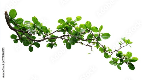 Obraz premium A slender branch with vibrant green leaves extends horizontally against a white background
