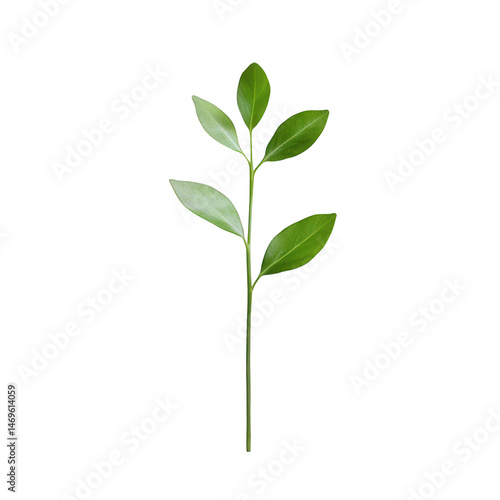 Fototapeta premium A slender green stem with several glossy leaves, showcasing natural beauty and freshness against a white background, perfect for botanical themes and design.