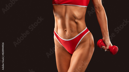 © Dimid, Fototapeta premium A slender swarthy Bodybuilder girl in red sportswear on a white background. Healthy lifestyle, sport and diet.