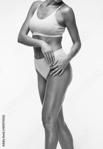 © Dimid, Naklejka premium A slender swarthy woman in beige underwear on a white background. Healthy lifestyle, sport and diet.