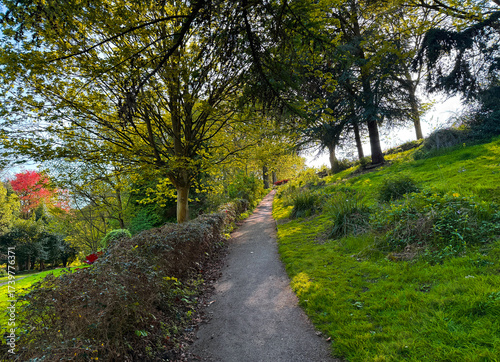 © derek oldfield, Fototapeta premium A slender trail curls through lush woodland. Sunlight dances through the leaves, casting shifting mosaics of light and shadow beneath the trees. in Northcliffe Park, Bradford, UK