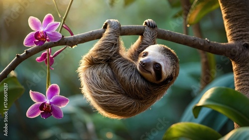 © Tina, Naklejka premium A sloth hanging from a branch surrounded by vibrant orchids in a lush green rainforest setting