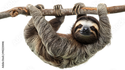 © growth, Fototapeta premium A Sloth Hanging on a Tree Branch Isolated on a White Background, Showcasing Its Unique, Relaxed Posture and Grasping Talons, Capturing the Endearing and Slow-Moving Nature of This Arboreal Mammal