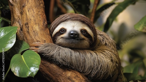 Fototapeta premium A sloth hangs from a branch, surrounded by green leaves. Background for...