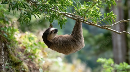 Obraz premium A sloth hangs lazily from a tree branch, surrounded by lush green foliage,...