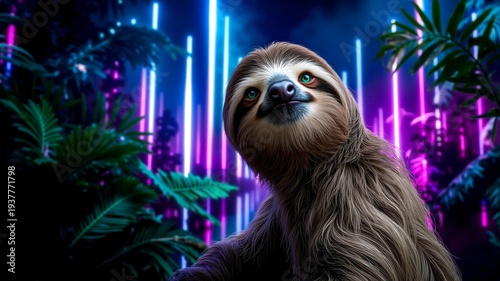 © Констянтин Батыльчук, Obraz premium A sloth in the middle of a jungle with neon lights