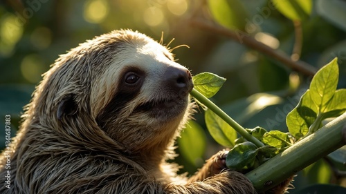 Naklejka premium A sloth munching on leaves in a lush, sunlit environment.