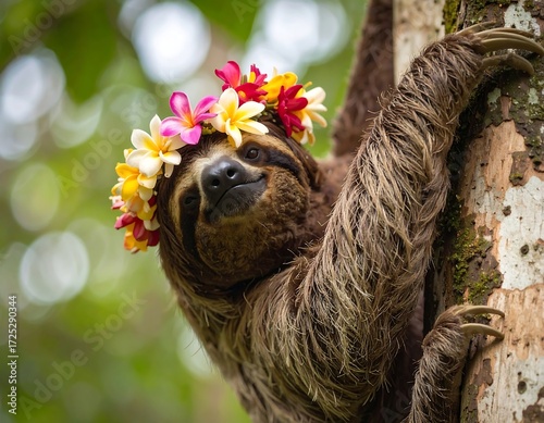 © Amelia, Obraz premium A sloth wearing a flower crown clings to a tree trunk