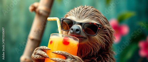 © Natsorn, Obraz premium A sloth wearing tiny sunglasses and sipping a coconut drink, animal, rainforest