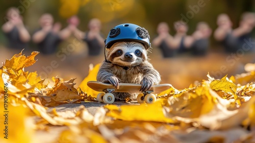 © Natalia, Obraz premium A sloth with a blue helmet on a skateboard surrounded by yellow leaves. Blurred figures are visible in the background. AI.