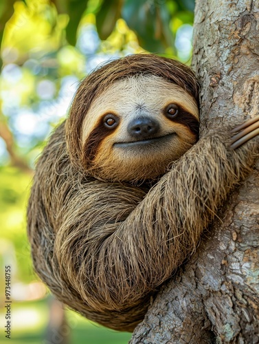 Naklejka premium A Sloth with a Gentle Expression, Clinging to a Tree Trunk