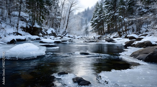 © Sam Studio, Fototapeta premium A slow-motion capture of a partially frozen river in a forest. Water flows visibly between sheets of clear ice, symbolizing persistence.