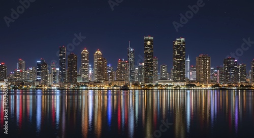 Fototapeta premium A slow pan of a vibrant city skyline at night, with illuminated skyscrapers and reflections on the water