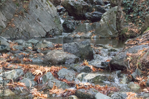 © daisy_y, Obraz premium A slow river flows through stones in forest.