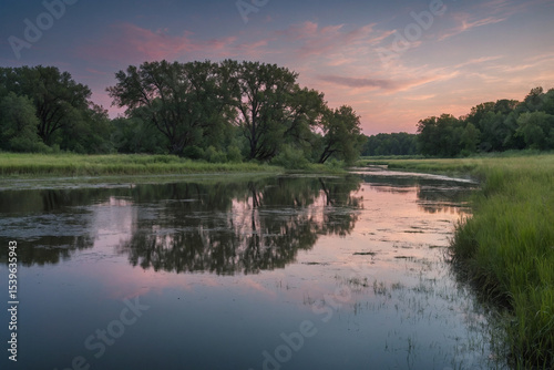© faisal, Obraz premium A slow river reflecting a pastel evening sky passing through a lowland field with sparse trees in the distance giving space to the landscape for cinematic storytelling the subtle color