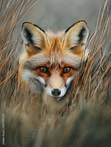 Obraz premium A sly fox observes its surroundings from a bed of tall grass, its sharp gaze...