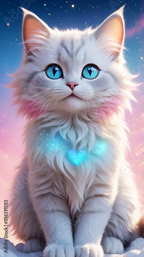 © Pujan, Fototapeta premium A small, adorable cat with vibrant gradient fur shifting between soft pastel pink and icy blue, accented by sparkling golden speckles on its back. Mobile phone wallpaper