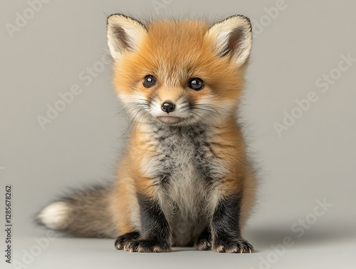 © Ardhana, Obraz premium A small adorable red fox cub sits patiently and looks forward