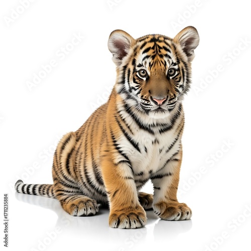 © Dama, Fototapeta premium A small, adorable tiger cub sits, showcasing its striking orange and black stripes against a plain white background.
