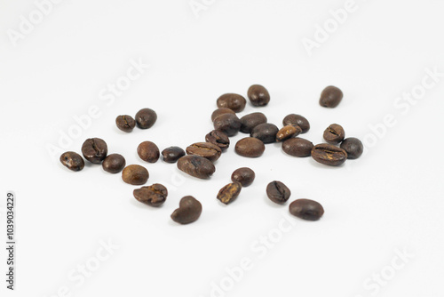 © Echo G, Naklejka premium A small amount of fresh roasted robusta and arabica coffee beans, isolated on white background