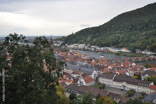 © Maksym, Obraz premium A small ancient town through which the river passes. Beautiful landscape of a European city. top view for postcard.
