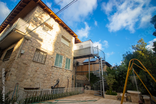 Obraz premium A small and narrow sukkah at the entrance to a beautiful two-story house in Jerusalem, Israel.