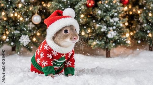 © Yevhen, Fototapeta premium A small animal wearing a festive red and green sweater with snowflakes. It has a cute face and is surrounded by Christmas trees and snow.